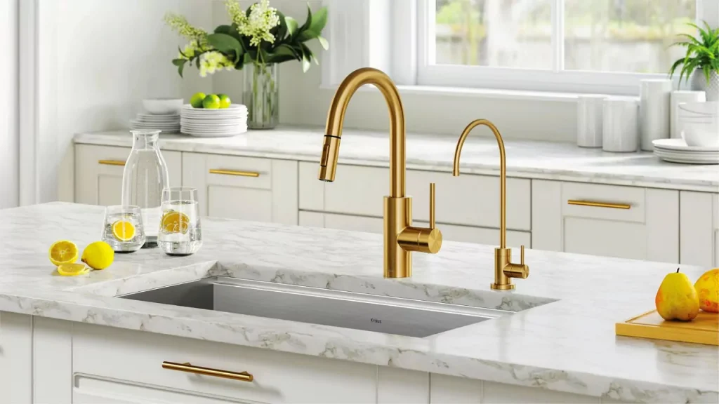 - Kraus KPF-1690 Single-Handle Kitchen Faucet – This gold kitchen faucet has a contemporary design, a single-handle design, and a pull-down spout.